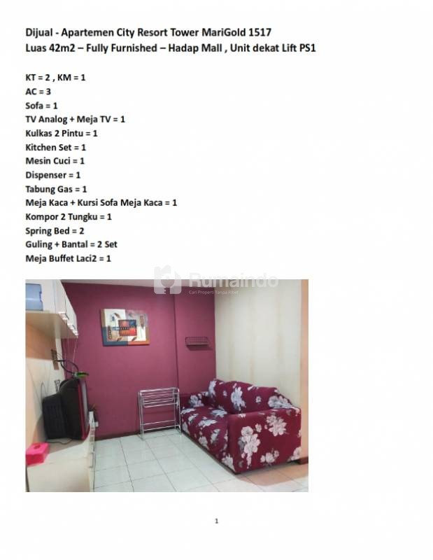 Dijual - Apartemen City Resort Tower MariGold 1517