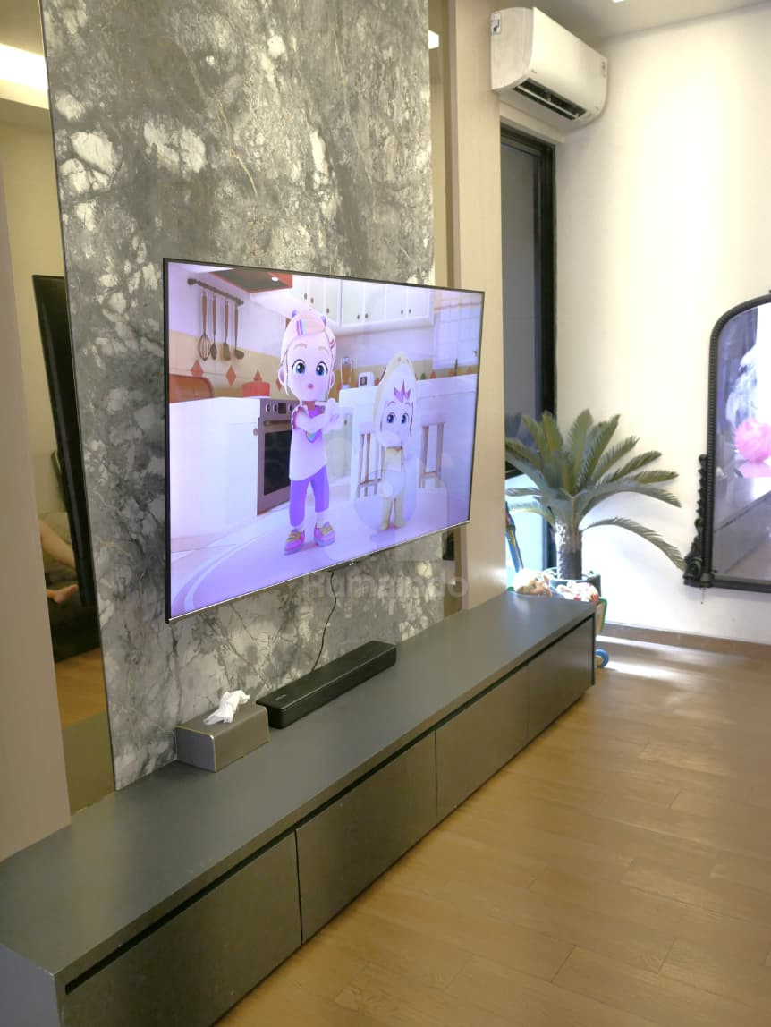 Ruang Keluarga Open-Plan: Kamar lantai dasar diubah menjadi area keluarga & hiburan dengan backdrop marmer elegan.