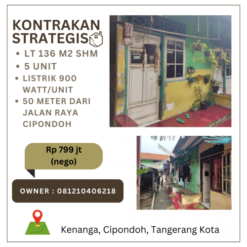 Kontrakan strategis area pabrik kavling DPR Cipondoh. Terdiri dari 23 rumah/unit. SHM. air jet pump. Listrik token
