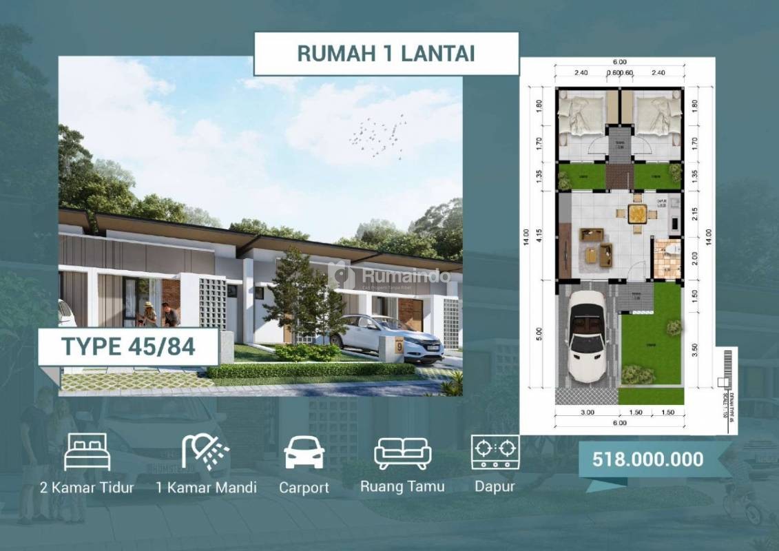 3KT + 2KM + Carport + Sisa Tanah Di Belakang